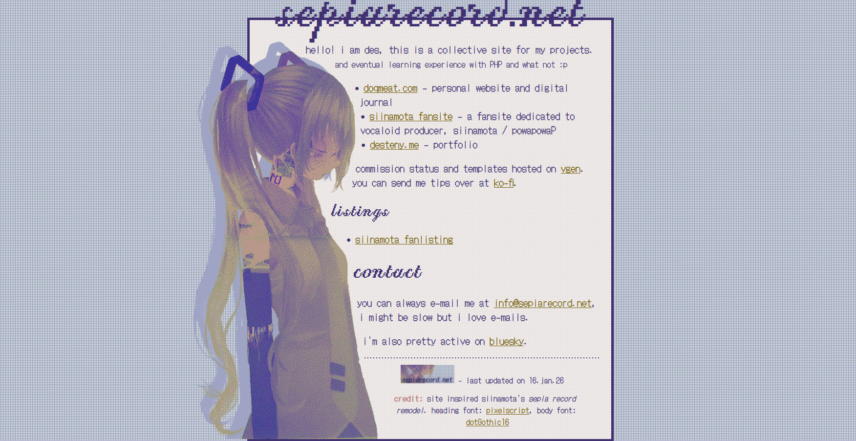 (2024 - ongoing) a fansite dedicated to my favorite vocaloid producer built with 11ty. a place to archive my album scans while also being accessible to other fans.